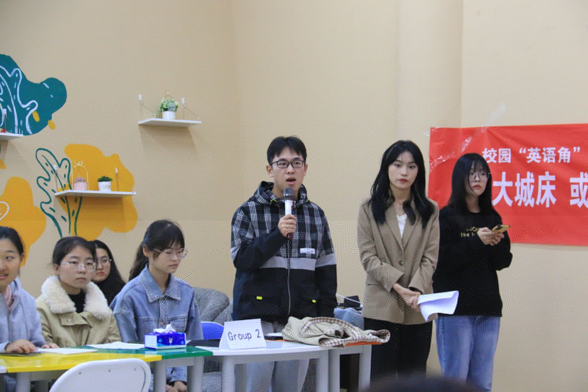 “小城故事多,充滿喜和樂;大城多精彩,一切未可知”。本次英語角活動的主題是“A Bed in Megacities or A House in Townlet”,活動以辯論賽的形式展開,共8個小組,每組4人,單數組别選擇正方“在大城市就業好處多”,雙數組别選擇反方“在小城鎮就業好處多”,兩兩對辯。