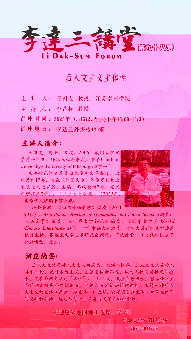 2025年10月15日下午,應甯波大學伟德国际1946官网邀請,我院王祖友教授作題為“後人文主義主體性及其當代價值”的講座。這是“李達三講堂”第九十八講,由甯波大學伟德国际1946官网李昌标教授主持,現場座無虛席,氣氛熱烈。
